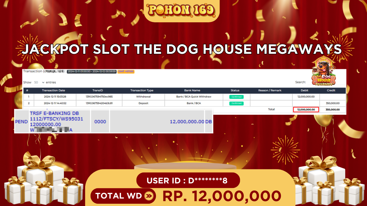 - POHON169: Situs Slot Online Terpercaya dan Terbukti Membayar Kami dengan bangga mempersembahkan bukti pembayaran kepada member kami dengan userid D********8, yang berhasil mendapatkan Jackpot (JP) pada permainan Slot THE DOG HOUSE MEGAWAYS dari provider PRAGMATIC PLAY. Hasil kemenangan yang luar biasa mencapai Rp 12,000,000.00 (Dua Belas Juta Rupiah) telah kami bayarkan dengan PROSES CEPAT dalam waktu kurang dari 5 menit.