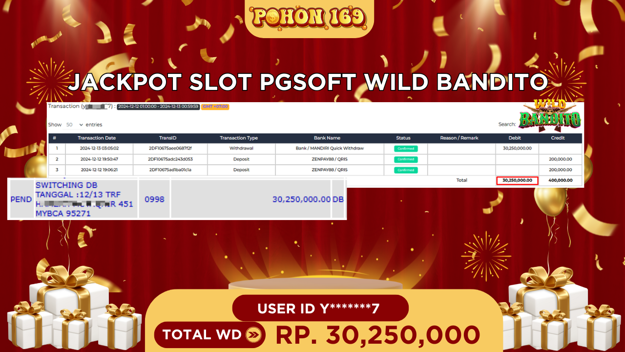 - POHON169: Situs Slot Online Terpercaya dan Terbukti Membayar Kami dengan bangga mempersembahkan bukti pembayaran kepada member kami dengan userid Y******7, yang berhasil mendapatkan Jackpot (JP) pada permainan Slot WILD BANDITO dari provider PGSOFT. Hasil kemenangan yang luar biasa mencapai Rp 30,250,000.00 (Tiga Puluh Juta Dua Ratus Lima Puluh Ribu Rupiah) telah kami bayarkan dengan PROSES CEPAT dalam waktu kurang dari 5 menit.
