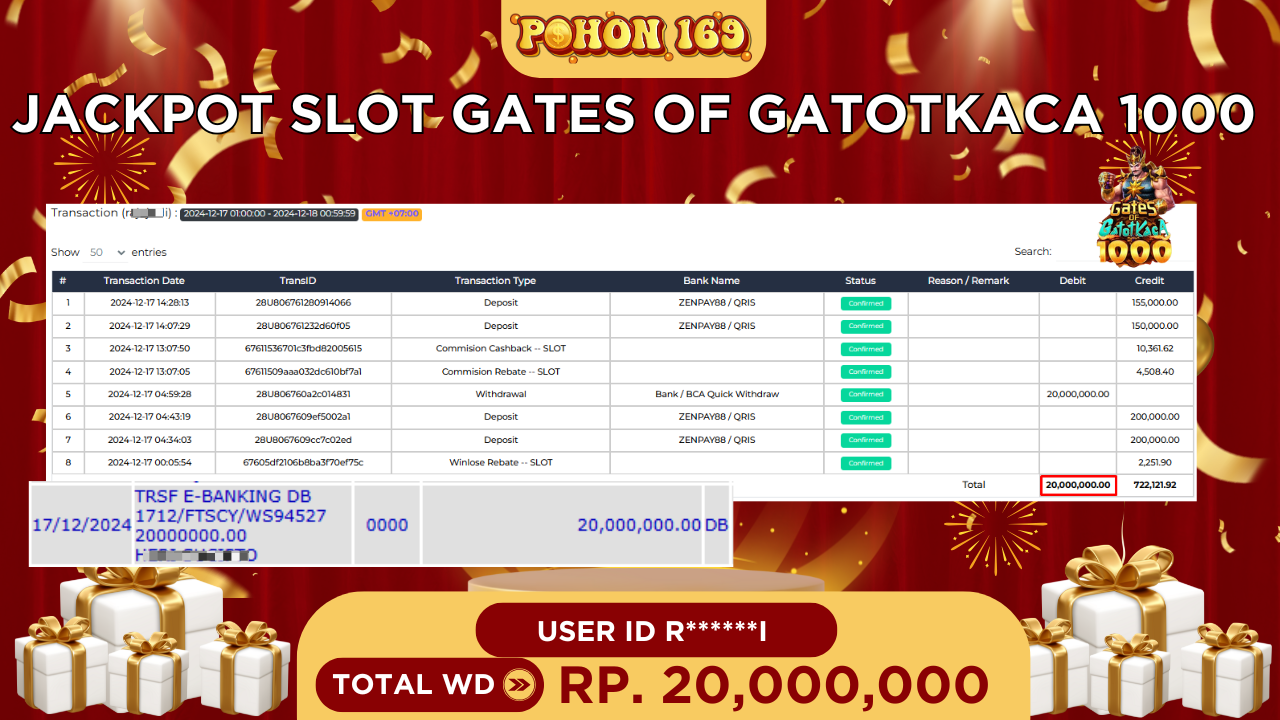 - POHON169: Situs Slot Online Terpercaya dan Terbukti Membayar Kami dengan bangga mempersembahkan bukti pembayaran kepada member kami dengan userid R******I, yang berhasil mendapatkan Jackpot (JP) pada permainan Slot GATES OF GATOTKACA 1000 dari provider PRAGMATIC. Hasil kemenangan yang luar biasa mencapai Rp 20,000,000.00 (Dua Puluh Juta Rupiah) telah kami bayarkan dengan PROSES CEPAT dalam waktu kurang dari 5 menit.