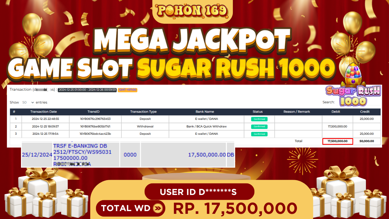 - POHON169: Situs Slot Online Terpercaya dan Terbukti Membayar Kami dengan bangga mempersembahkan bukti pembayaran kepada member kami dengan userid D*******S, yang berhasil mendapatkan Jackpot (JP) pada permainan SLOT SUGAR RUSH 1000 dari provider PRAGMATIC PLAY. Hasil kemenangan yang luar biasa mencapai Rp 17,500,000.00 (Tujuh Belas Juta Lima Ratus Ribu Rupiah) telah kami bayarkan dengan PROSES CEPAT dalam waktu kurang dari 5 menit.