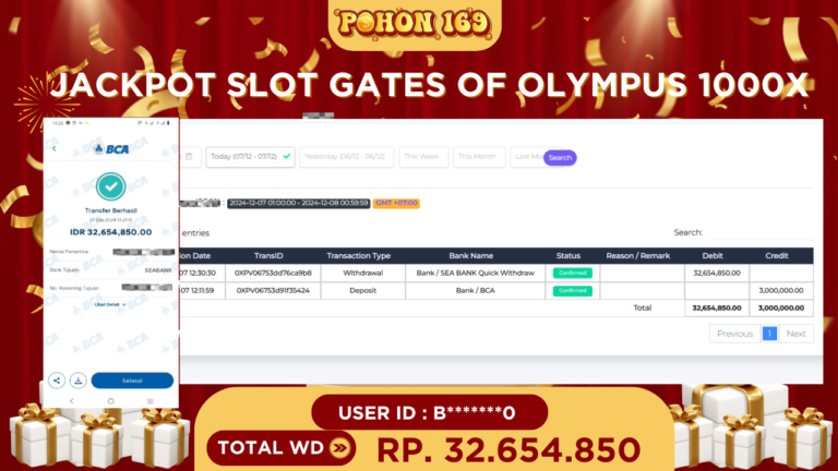 BUKTI PEMBAYARAN POHON169 SEBESAR 32,654,850.00 RUPIAH (SLOT GATES OF OLYMPUS 1000X)